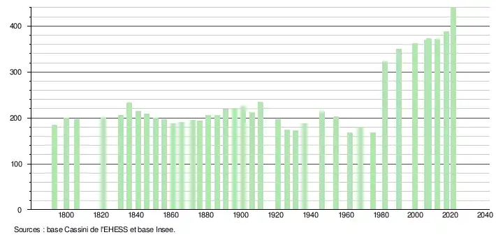 L'évolution du nombre d'habitants est connue à travers les recensements de la population effectués dans la commune depuis 1793. Pour les communes de moins de 10 000 habitants, une enquête de recensement portant sur toute la population est réalisée tous les cinq ans, les populations légales des années intermédiaires étant quant à elles estimées par interpolation ou extrapolation[22]. Pour la commune, le premier recensement exhaustif entrant dans le cadre du nouveau dispositif a été réalisé en 2007[23].