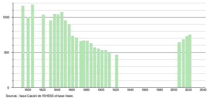 | L'évolution du nombre d'habitants est connue à travers les recensements de la population effectués dans la commune depuis 1793. Pour les communes de moins de 10 000 habitants, une enquête de recensement portant sur toute la population est réalisée tous les cinq ans, les populations légales des années intermédiaires étant quant à elles estimées par interpolation ou extrapolation[37]. Pour la commune, le premier recensement exhaustif entrant dans le cadre du nouveau dispositif a été réalisé en 2007[38]. En 2021, la commune comptait 753 habitants[Note 11], en augmentation de 4,15 % par rapport à 2015 (Tarn-et-Garonne : +3,17 %, France hors Mayotte : +1,84 %). |
