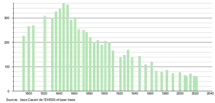 L'évolution du nombre d'habitants est connue à travers les recensements de la population effectués dans la commune depuis 1793. Pour les communes de moins de 10 000 habitants, une enquête de recensement portant sur toute la population est réalisée tous les cinq ans, les populations légales des années intermédiaires étant quant à elles estimées par interpolation ou extrapolation[16]. Pour la commune, le premier recensement exhaustif entrant dans le cadre du nouveau dispositif a été réalisé en 2008[17].