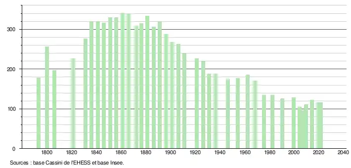 L'évolution du nombre d'habitants est connue à travers les recensements de la population effectués dans la commune depuis 1793. Pour les communes de moins de 10 000 habitants, une enquête de recensement portant sur toute la population est réalisée tous les cinq ans, les populations légales des années intermédiaires étant quant à elles estimées par interpolation ou extrapolation[26]. Pour la commune, le premier recensement exhaustif entrant dans le cadre du nouveau dispositif a été réalisé en 2004[27].