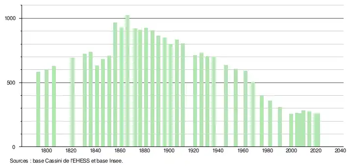 L'évolution du nombre d'habitants est connue à travers les recensements de la population effectués dans la commune depuis 1793. Pour les communes de moins de 10 000 habitants, une enquête de recensement portant sur toute la population est réalisée tous les cinq ans, les populations légales des années intermédiaires étant quant à elles estimées par interpolation ou extrapolation[34]. Pour la commune, le premier recensement exhaustif entrant dans le cadre du nouveau dispositif a été réalisé en 2004[35].