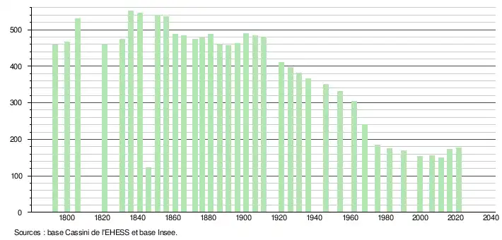 L'évolution du nombre d'habitants est connue à travers les recensements de la population effectués dans la commune depuis 1793. Pour les communes de moins de 10 000 habitants, une enquête de recensement portant sur toute la population est réalisée tous les cinq ans, les populations légales des années intermédiaires étant quant à elles estimées par interpolation ou extrapolation[17]. Pour la commune, le premier recensement exhaustif entrant dans le cadre du nouveau dispositif a été réalisé en 2006[18].