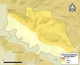 Le retrait-gonflement des sols argileux est susceptible d'engendrer des dommages importants aux bâtiments en cas d’alternance de périodes de sécheresse et de pluie[29]. 63 % de la superficie communale est en aléa moyen ou fort (59 % au niveau départemental et 48,5 % au niveau national)[Carte 3]. Depuis le , en application de la loi ELAN, différentes contraintes s'imposent aux vendeurs, maîtres d'ouvrages ou constructeurs de biens situés dans une zone classée en aléa moyen ou fort[Note 5],[30].