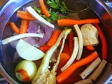 Le bouillon de légumes est un liquide passé et décanté obtenu en faisant cuire doucement des légumes (carottes, navets, poireaux, oignons, panais, céleri et selon le besoin avec des pommes de terre, des légumes secs et des céréales) dans de l'eau bouillante. Il est servi chaud ou froid ou utilisé pour la confection de sauces, de cuissons ou autres préparations culinaires.