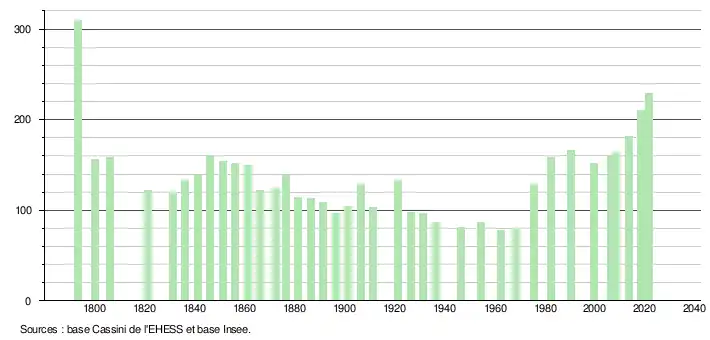 L'évolution du nombre d'habitants est connue à travers les recensements de la population effectués dans la commune depuis 1793. Pour les communes de moins de 10 000 habitants, une enquête de recensement portant sur toute la population est réalisée tous les cinq ans, les populations légales des années intermédiaires étant quant à elles estimées par interpolation ou extrapolation[20]. Pour la commune, le premier recensement exhaustif entrant dans le cadre du nouveau dispositif a été réalisé en 2008[21].