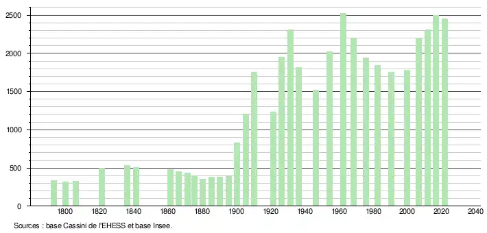 L'évolution du nombre d'habitants est connue à travers les recensements de la population effectués dans la commune depuis 1793. Pour les communes de moins de 10 000 habitants, une enquête de recensement portant sur toute la population est réalisée tous les cinq ans, les populations légales des années intermédiaires étant quant à elles estimées par interpolation ou extrapolation[29]. Pour la commune, le premier recensement exhaustif entrant dans le cadre du nouveau dispositif a été réalisé en 2006[30].
