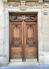 - No 44 : immeuble dont la porte d’entrée porte la mention, gravée dans le bois, « Valeant qui dissidiu volunt ». Cette inscription, empruntée à un vers de L’Andrienne de Térence[11], peut se traduire par : « Hors d’ici les querelleurs ». L’avocat et homme politique Maurice Sibille (1847-1932) est mort à cette adresse où il avait son domicile[12].