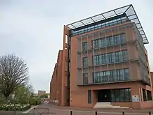 Au nord, la salle d'assemblée est accessible par un large escalier. Au sud s'élèvent trois bâtiments rectangulaires légèrement coudés, placés en porte-à-faux. Ils reposent sur un socle en béton. Les façades de verre sont structurées par un quadrillage en béton brut en forte saillie. Les toits-terrasses sont végétalisés.