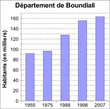 Dans son ouvrage paru en 1955, B. Holas indique une population de 92 000 habitants pour la « subdivision » de Boundiali sur une superficie de 9 150 km2, soit une densité de 10 habitants par km²[52]. Il est à noter toutefois que cette subdivision incluait le territoire qui constitue l'actuel département de Tingréla.