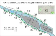 - 1957 : 238 bouquinistes, selon le recensement du , dont 109 femmes et 129 hommes. Leurs étalages se répartissaient alors entre la Rive gauche et la Rive droite, d'amont en aval, de la manière suivante :