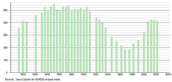L'évolution du nombre d'habitants est connue à travers les recensements de la population effectués dans la commune depuis 1793. Pour les communes de moins de 10 000 habitants, une enquête de recensement portant sur toute la population est réalisée tous les cinq ans, les populations légales des années intermédiaires étant quant à elles estimées par interpolation ou extrapolation[24]. Pour la commune, le premier recensement exhaustif entrant dans le cadre du nouveau dispositif a été réalisé en 2006[25].