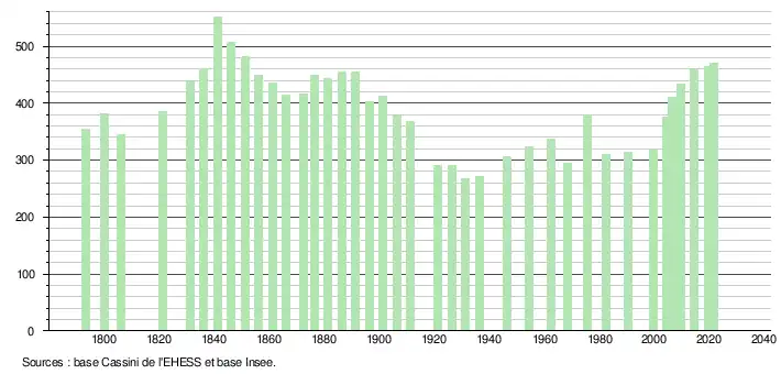L'évolution du nombre d'habitants est connue à travers les recensements de la population effectués dans la commune depuis 1793. Pour les communes de moins de 10 000 habitants, une enquête de recensement portant sur toute la population est réalisée tous les cinq ans, les populations légales des années intermédiaires étant quant à elles estimées par interpolation ou extrapolation[23]. Pour la commune, le premier recensement exhaustif entrant dans le cadre du nouveau dispositif a été réalisé en 2004[24].