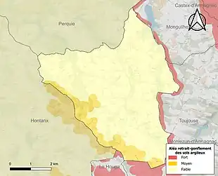 Le retrait-gonflement des sols argileux est susceptible d'engendrer des dommages importants aux bâtiments en cas d’alternance de périodes de sécheresse et de pluie. 12,5 % de la superficie communale est en aléa moyen ou fort (19,2 % au niveau départemental et 48,5 % au niveau national). Sur les 121 bâtiments dénombrés sur la commune en 2019, 5 sont en aléa moyen ou fort, soit 4 %, à comparer aux 17 % au niveau départemental et 54 % au niveau national. Une cartographie de l'exposition du territoire national au retrait gonflement des sols argileux est disponible sur le site du BRGM[21],[Carte 2].