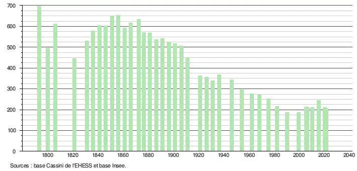 L'évolution du nombre d'habitants est connue à travers les recensements de la population effectués dans la commune depuis 1793. Pour les communes de moins de 10 000 habitants, une enquête de recensement portant sur toute la population est réalisée tous les cinq ans, les populations légales des années intermédiaires étant quant à elles estimées par interpolation ou extrapolation[24]. Pour la commune, le premier recensement exhaustif entrant dans le cadre du nouveau dispositif a été réalisé en 2005[25].