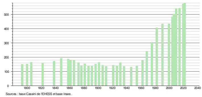 L'évolution du nombre d'habitants est connue à travers les recensements de la population effectués dans la commune depuis 1793. Pour les communes de moins de 10 000 habitants, une enquête de recensement portant sur toute la population est réalisée tous les cinq ans, les populations légales des années intermédiaires étant quant à elles estimées par interpolation ou extrapolation[27]. Pour la commune, le premier recensement exhaustif entrant dans le cadre du nouveau dispositif a été réalisé en 2004[28].