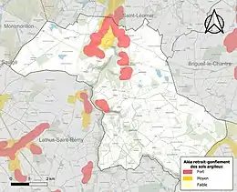 Les mouvements de terrains susceptibles de se produire sur la commune sont des tassements différentiels[27]. Le retrait-gonflement des sols argileux est susceptible d'engendrer des dommages importants aux bâtiments en cas d’alternance de périodes de sécheresse et de pluie[28]. 8,3 % de la superficie communale est en aléa moyen ou fort (79,5 % au niveau départemental et 48,5 % au niveau national)[Carte 2]. Depuis le , en application de la loi ÉLAN, différentes contraintes s'imposent aux vendeurs, maîtres d'ouvrages ou constructeurs de biens situés dans une zone classée en aléa moyen ou fort[Note 4],[29].
