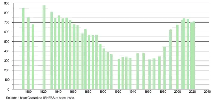 L'évolution du nombre d'habitants est connue à travers les recensements de la population effectués dans la commune depuis 1793. Pour les communes de moins de 10 000 habitants, une enquête de recensement portant sur toute la population est réalisée tous les cinq ans, les populations légales des années intermédiaires étant quant à elles estimées par interpolation ou extrapolation[21]. Pour la commune, le premier recensement exhaustif entrant dans le cadre du nouveau dispositif a été réalisé en 2008[22].
