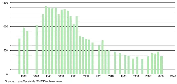L'évolution du nombre d'habitants est connue à travers les recensements de la population effectués dans la commune depuis 1793. Pour les communes de moins de 10 000 habitants, une enquête de recensement portant sur toute la population est réalisée tous les cinq ans, les populations légales des années intermédiaires étant quant à elles estimées par interpolation ou extrapolation[29]. Pour la commune, le premier recensement exhaustif entrant dans le cadre du nouveau dispositif a été réalisé en 2005[33].