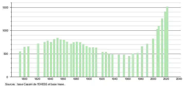 L'évolution du nombre d'habitants est connue à travers les recensements de la population effectués dans la commune depuis 1793. Pour les communes de moins de 10 000 habitants, une enquête de recensement portant sur toute la population est réalisée tous les cinq ans, les populations légales des années intermédiaires étant quant à elles estimées par interpolation ou extrapolation[26]. Pour la commune, le premier recensement exhaustif entrant dans le cadre du nouveau dispositif a été réalisé en 2008[27].