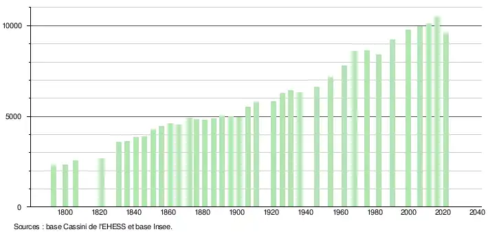 - Par convention dans Wikipédia, le principe a été retenu de n’afficher dans le tableau des recensements et le graphique, pour les populations légales postérieures à 1999, que les populations correspondant à une enquête exhaustive de recensement pour les communes de moins de 10 000 habitants, et que les populations des années 2006, 2011, 2016, etc. pour les communes de plus de 10 000 habitants, ainsi que la dernière population légale publiée par l’Insee pour l'ensemble des communes.