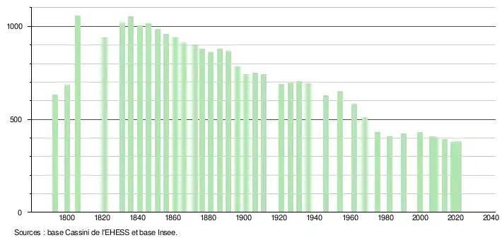 | L'évolution du nombre d'habitants est connue à travers les recensements de la population effectués dans la commune depuis 1793. Pour les communes de moins de 10 000 habitants, une enquête de recensement portant sur toute la population est réalisée tous les cinq ans, les populations légales des années intermédiaires étant quant à elles estimées par interpolation ou extrapolation[34]. Pour la commune, le premier recensement exhaustif entrant dans le cadre du nouveau dispositif a été réalisé en 2008[35]. En 2021, la commune comptait 381 habitants[Note 8], en diminution de 2,06 % par rapport à 2015 (Tarn-et-Garonne : +3,17 %, France hors Mayotte : +1,84 %). |