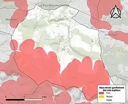 Les mouvements de terrains susceptibles de se produire sur la commune sont des affaissements et effondrements liés aux cavités souterraines (hors mines) et des tassements différentiels[38]. Afin de mieux appréhender le risque d’affaissement de terrain, un inventaire national permet de localiser les éventuelles cavités souterraines sur la commune[39]. Le retrait-gonflement des sols argileux est susceptible d'engendrer des dommages importants aux bâtiments en cas d’alternance de périodes de sécheresse et de pluie[40]. 45,6 % de la superficie communale est en aléa moyen ou fort (58,6 % au niveau départemental et 48,5 % au niveau national métropolitain)[Carte 4]. Depuis le , en application de la loi ÉLAN, différentes contraintes s'imposent aux vendeurs, maîtres d'ouvrages ou constructeurs de biens situés dans une zone classée en aléa moyen ou fort[Note 5],[41].