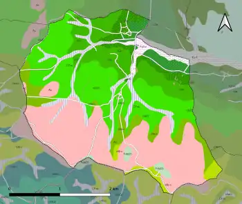 L'occupation des sols de la commune, telle qu'elle ressort de la base de données européenne d’occupation biophysique des sols Corine Land Cover (CLC), est marquée par l'importance des forêts et milieux semi-naturels (52,4 % en 2018), néanmoins en diminution par rapport à 1990 (59,2 %). La répartition détaillée en 2018 est la suivante : forêts (52,4 %), terres arables (17,7 %), mines, décharges et chantiers (11,5 %), prairies (9,2 %), zones agricoles hétérogènes (9,1 %)[31]. L'évolution de l’occupation des sols de la commune et de ses infrastructures peut être observée sur les différentes représentations cartographiques du territoire : la carte de Cassini (XVIIIe siècle), la carte d'état-major (1820-1866) et les cartes ou photos aériennes de l'IGN pour la période actuelle (1950 à aujourd'hui)[Carte 3].