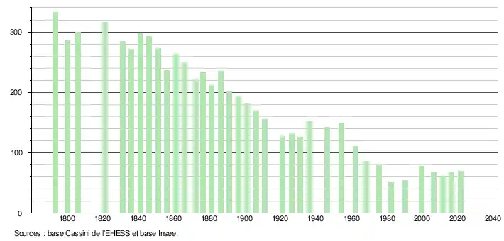L'évolution du nombre d'habitants est connue à travers les recensements de la population effectués dans la commune depuis 1793. Pour les communes de moins de 10 000 habitants, une enquête de recensement portant sur toute la population est réalisée tous les cinq ans, les populations légales des années intermédiaires étant quant à elles estimées par interpolation ou extrapolation[50]. Pour la commune, le premier recensement exhaustif entrant dans le cadre du nouveau dispositif a été réalisé en 2006[51].