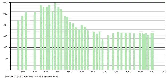 L'évolution du nombre d'habitants est connue à travers les recensements de la population effectués dans la commune depuis 1793. Pour les communes de moins de 10 000 habitants, une enquête de recensement portant sur toute la population est réalisée tous les cinq ans, les populations légales des années intermédiaires étant quant à elles estimées par interpolation ou extrapolation[17]. Pour la commune, le premier recensement exhaustif entrant dans le cadre du nouveau dispositif a été réalisé en 2004[18].