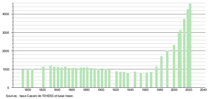 L'évolution du nombre d'habitants est connue à travers les recensements de la population effectués dans la commune depuis 1793. Pour les communes de moins de 10 000 habitants, une enquête de recensement portant sur toute la population est réalisée tous les cinq ans, les populations légales des années intermédiaires étant quant à elles estimées par interpolation ou extrapolation[34]. Pour la commune, le premier recensement exhaustif entrant dans le cadre du nouveau dispositif a été réalisé en 2008[35].