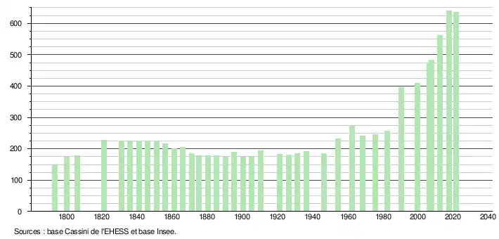 L'évolution du nombre d'habitants est connue à travers les recensements de la population effectués dans la commune depuis 1793. Pour les communes de moins de 10 000 habitants, une enquête de recensement portant sur toute la population est réalisée tous les cinq ans, les populations légales des années intermédiaires étant quant à elles estimées par interpolation ou extrapolation[19]. Pour la commune, le premier recensement exhaustif entrant dans le cadre du nouveau dispositif a été réalisé en 2007[20].