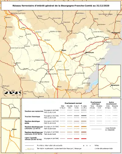 Le réseau ferré en Bourgogne-Franche-Comté s’organise autour des principales agglomérations : Besançon et Dijon. La principale ligne est la ligne Paris-Belfort via Dijon et Besançon. Cette ligne est LGV de Paris à Montbard (LGV Sud-Est) et de Dijon à Belfort (LGV Rhin-Rhône). Le territoire est également quadrillé par des voies secondaires, où circulent principalement des TER Bourgogne-Franche-Comté, sur un réseau de 1 951 km[6].