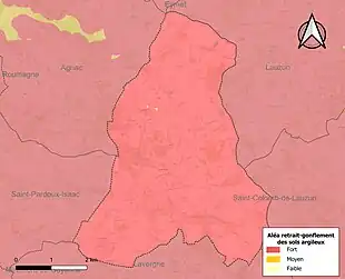 Le retrait-gonflement des sols argileux est susceptible d'engendrer des dommages importants aux bâtiments en cas d’alternance de périodes de sécheresse et de pluie[19]. La totalité de la commune est en aléa moyen ou fort (91,8 % au niveau départemental et 48,5 % au niveau national)[Carte 2]. Depuis le , en application de la loi ELAN, différentes contraintes s'imposent aux vendeurs, maîtres d'ouvrages ou constructeurs de biens situés dans une zone classée en aléa moyen ou fort[Note 3],[20].