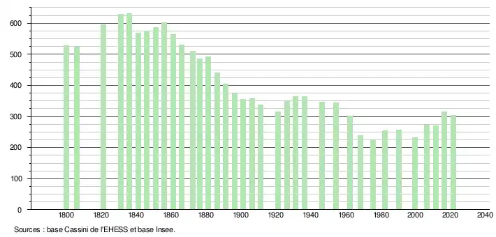 L'évolution du nombre d'habitants est connue à travers les recensements de la population effectués dans la commune depuis 1800. Pour les communes de moins de 10 000 habitants, une enquête de recensement portant sur toute la population est réalisée tous les cinq ans, les populations légales des années intermédiaires étant quant à elles estimées par interpolation ou extrapolation[21]. Pour la commune, le premier recensement exhaustif entrant dans le cadre du nouveau dispositif a été réalisé en 2006[22].