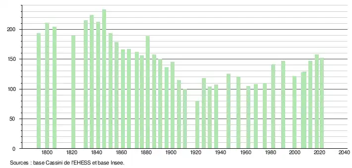 L'évolution du nombre d'habitants est connue à travers les recensements de la population effectués dans la commune depuis 1793. Pour les communes de moins de 10 000 habitants, une enquête de recensement portant sur toute la population est réalisée tous les cinq ans, les populations légales des années intermédiaires étant quant à elles estimées par interpolation ou extrapolation[25]. Pour la commune, le premier recensement exhaustif entrant dans le cadre du nouveau dispositif a été réalisé en 2007[26].