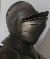 Bourguignotte des années 1560 fabriquée à Nuremberg, exposant la face. Décorée au XVIIe siècle. Higgins Armory Museum (en).