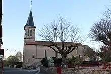 - l'église, placée sous le vocable de saint Denis, construite en remplacement d'un vieil édifice qui, en mauvais état, fut partiellement démoli et reconstruit entre 1873 et 1875 (clocher, partie des murs de la nef, réfection complète des voûtes)[21] ;