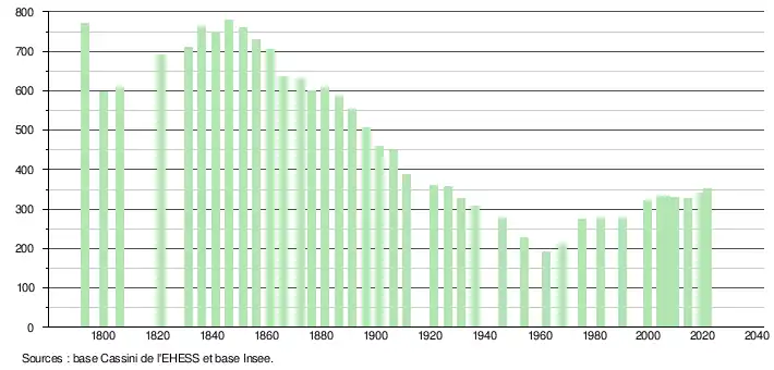 L'évolution du nombre d'habitants est connue à travers les recensements de la population effectués dans la commune depuis 1793. Pour les communes de moins de 10 000 habitants, une enquête de recensement portant sur toute la population est réalisée tous les cinq ans, les populations légales des années intermédiaires étant quant à elles estimées par interpolation ou extrapolation[16]. Pour la commune, le premier recensement exhaustif entrant dans le cadre du nouveau dispositif a été réalisé en 2004[17].