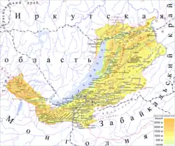 La république de Bouriatie fait partie d'une zone montagneuse avec des zones d'altitude, occupant une partie importante du sud de la Sibérie orientale. L'altitude est en moyenne d'environ 500 à 700 m. Le relief est caractérisé par de puissantes chaînes de montagnes et des bassins intermontagnards vastes, profonds et parfois presque fermés. La superficie des montagnes est plus de 4 fois supérieure à celle occupée par les plaines. La Bouriatie se caractérise par une élévation significative au-dessus du niveau de la mer et, par conséquent, une pression atmosphérique moyenne très basse. Le niveau le plus bas est le niveau du lac Baïkal, 455 m au-dessus du niveau de la mer[2], et le plus haut est le sommet couvert de glaciers du Mounkou-Sardyk dans le Saïan oriental, avec ses 3 491 m d'altitude[3].