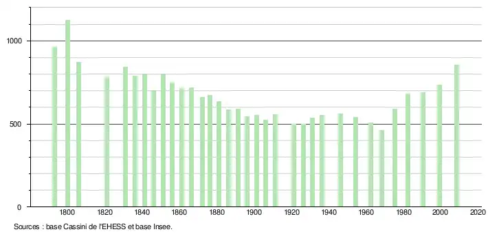 L'évolution du nombre d'habitants est connue à travers les recensements de la population effectués dans la commune depuis 1793. À partir du , les populations légales des communes sont publiées annuellement dans le cadre d'un recensement qui repose désormais sur une collecte d'information annuelle, concernant successivement tous les territoires communaux au cours d'une période de cinq ans. Pour les communes de moins de 10 000 habitants, une enquête de recensement portant sur toute la population est réalisée tous les cinq ans, les populations légales des années intermédiaires étant quant à elles estimées par interpolation ou extrapolation[4]. Pour la commune, le premier recensement exhaustif entrant dans le cadre du nouveau dispositif a été réalisé en 2008[5],[Note 1].