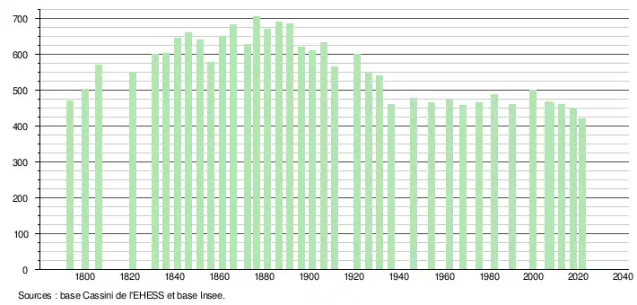 L'évolution du nombre d'habitants est connue à travers les recensements de la population effectués dans la commune depuis 1793. Pour les communes de moins de 10 000 habitants, une enquête de recensement portant sur toute la population est réalisée tous les cinq ans, les populations légales des années intermédiaires étant quant à elles estimées par interpolation ou extrapolation[21]. Pour la commune, le premier recensement exhaustif entrant dans le cadre du nouveau dispositif a été réalisé en 2007[22].