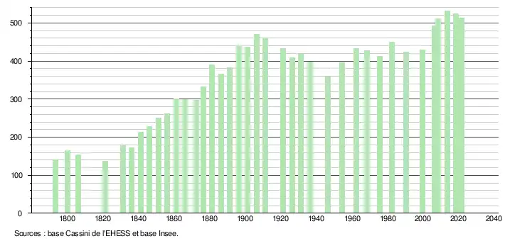 L'évolution du nombre d'habitants est connue à travers les recensements de la population effectués dans la commune depuis 1793. Pour les communes de moins de 10 000 habitants, une enquête de recensement portant sur toute la population est réalisée tous les cinq ans, les populations légales des années intermédiaires étant quant à elles estimées par interpolation ou extrapolation[20]. Pour la commune, le premier recensement exhaustif entrant dans le cadre du nouveau dispositif a été réalisé en 2008[21].