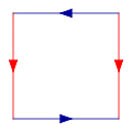 Si les deux segments bleus étaient orientés de la même façon, le recollement des segments opposés donnerait un tore. Si au contraire, les deux segments rouges étaient orientés en sens inverse comme les deux segments bleus, le recollement des segments opposés donnerait un plan projectif.