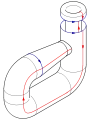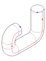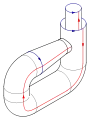 Voici un plan de montage dans ℝ3. À partir du carré initial, on colle les deux bords rouges l'un contre l'autre, dans le sens des flèches. La figure obtenue est un cylindre, dont on veut identifier les deux bords à l'aide des flèches bleues. Pour respecter le sens de ces flèches, il est nécessaire de retourner l'un des cercles avant de le recoller à l'autre, et pour cela, d'opérer une auto-intersection.