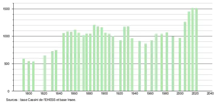 L'évolution du nombre d'habitants est connue à travers les recensements de la population effectués dans la commune depuis 1793. Pour les communes de moins de 10 000 habitants, une enquête de recensement portant sur toute la population est réalisée tous les cinq ans, les populations légales des années intermédiaires étant quant à elles estimées par interpolation ou extrapolation[17]. Pour la commune, le premier recensement exhaustif entrant dans le cadre du nouveau dispositif a été réalisé en 2006[18].