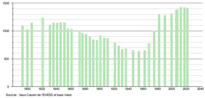 L'évolution du nombre d'habitants est connue à travers les recensements de la population effectués dans la commune depuis 1793. Pour les communes de moins de 10 000 habitants, une enquête de recensement portant sur toute la population est réalisée tous les cinq ans, les populations légales des années intermédiaires étant quant à elles estimées par interpolation ou extrapolation[18]. Pour la commune, le premier recensement exhaustif entrant dans le cadre du nouveau dispositif a été réalisé en 2007[19].