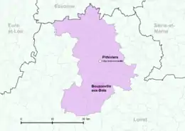 La loi du portant nouvelle organisation territoriale de la République (dite loi NOTRe), visant une réduction du nombre d'intercommunalités en France, fait en effet passer le seuil démographique minimal de 5 000 à 15 000 habitants, sauf exceptions, et a un impact sur les périmètres des différentes intercommunalités. Le schéma départemental de coopération intercommunale du Loiret est arrêté sur ces bases le et le nombre d'établissements publics de coopération intercommunale à fiscalité propre passe dans le département du Loiret de 28 (2 communautés d'agglomération et 26 communautés de communes) à 16 (deux communautés d'agglomération et 14 communautés de communes dont une interdépartementale)[39]. Les communautés de communes de Beauce et du Gâtinais, du Cœur du Pithiverais et du Plateau Beauceron fusionnent ainsi à compter du en une seule entité : la communauté de communes du Pithiverais, dont le siège est à Pithiviers. Cette nouvelle intercommunalité comprend 31 communes dont Bouzonville-aux-Bois[40].