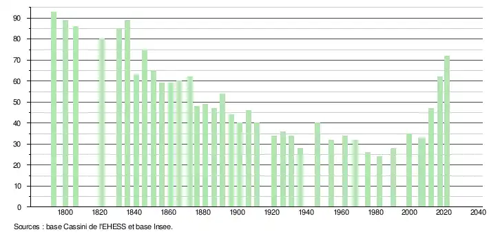 L'évolution du nombre d'habitants est connue à travers les recensements de la population effectués dans la commune depuis 1793. Pour les communes de moins de 10 000 habitants, une enquête de recensement portant sur toute la population est réalisée tous les cinq ans, les populations légales des années intermédiaires étant quant à elles estimées par interpolation ou extrapolation[18]. Pour la commune, le premier recensement exhaustif entrant dans le cadre du nouveau dispositif a été réalisé en 2007[19].