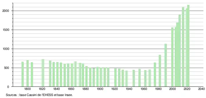 L'évolution du nombre d'habitants est connue à travers les recensements de la population effectués dans la commune depuis 1793. Pour les communes de moins de 10 000 habitants, une enquête de recensement portant sur toute la population est réalisée tous les cinq ans, les populations légales des années intermédiaires étant quant à elles estimées par interpolation ou extrapolation[24]. Pour la commune, le premier recensement exhaustif entrant dans le cadre du nouveau dispositif a été réalisé en 2004[25].