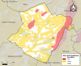 La commune est vulnérable au risque de mouvements de terrains constitué principalement du retrait-gonflement des sols argileux[17]. Cet aléa est susceptible d'engendrer des dommages importants aux bâtiments en cas d’alternance de périodes de sécheresse et de pluie. 65,6 % de la superficie communale est en aléa moyen ou fort (90 % au niveau départemental et 48,5 % au niveau national). Sur les 425 bâtiments dénombrés sur la commune en 2019, 227 sont en aléa moyen ou fort, soit 53 %, à comparer aux 83 % au niveau départemental et 54 % au niveau national. Une cartographie de l'exposition du territoire national au retrait gonflement des sols argileux est disponible sur le site du BRGM[18],[Carte 2].